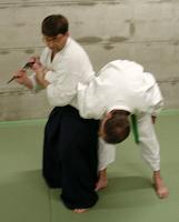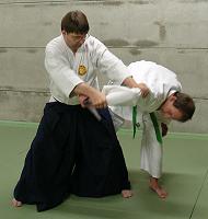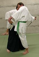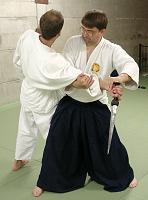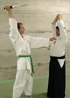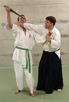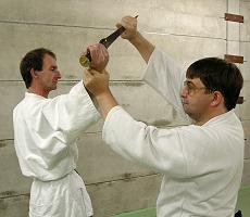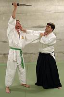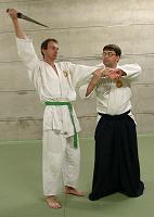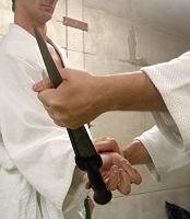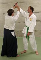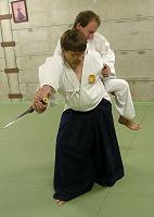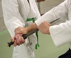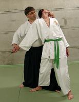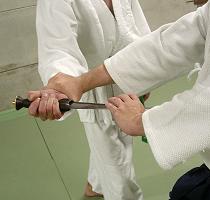 Against throat hold and downward stab, a quite painful blow to the elbow joint: