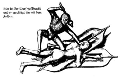 Schild und Kolben (shield and club) is a Frankish style trial by combat. The shield is a huge rectangular affair with a staff running along the back functioning as a grip, whose protruding pointy ends can be used to stab. The main tactic seems to be to bring your own shield between the opponent's and himself, so he becomes unprotected. In the judicial duel the participants wear a tight outfit with a cap, that according to Hutton was leather, sewn on the person, and smeared in grease. I suppose this precludes any last minute trip to the restroom...