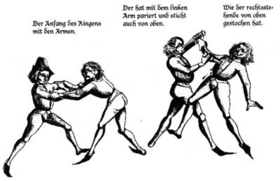 Unarmed fighting is called Ringen and consists mostly of throws by balance disruption or joint manipulation. Some techniques stretch over more than one Tafel, which is occasionally confusing when they continue on the right instead of the left side of the tafel. Counters are given to certain moves, or the counter is integrated in the main drawing (for example, the loser might be depicted as making a grab to the winner's groin while being thrown).