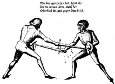 In his book on medieval swordsmanship, John Clements suggests the drawings in this chapter represent men training with blunts and the reader should imagine the armour and gloves. However, this doesn't seem likely since there is another chapter on fighting in full gear (voller Rustung). In the judicial duels, combatants are drawn wearing the special trial outfit. There is no justification for only this one chapter to appeal to the reader's imagination. Also, with all the blood and gore and fatal injuries depicted, it looks like a funny way to train.