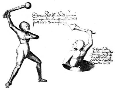 The next chapter shows a judicial duel between husband and wife. The man has a club and stands in a hole up to his waist as a handicap. The woman has a sling, a 5lb stone in a sock, as weapon, and is also dressed in tight leather (those naughty middle agers!). Talhoffer gives advice to the woman too (so were there women in his school or among his readers?).