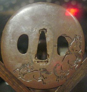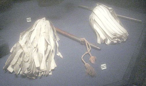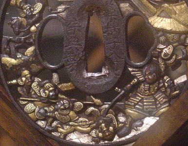 A gunsen (war-fan), war-horn, and a jinbaori in printed deer leather